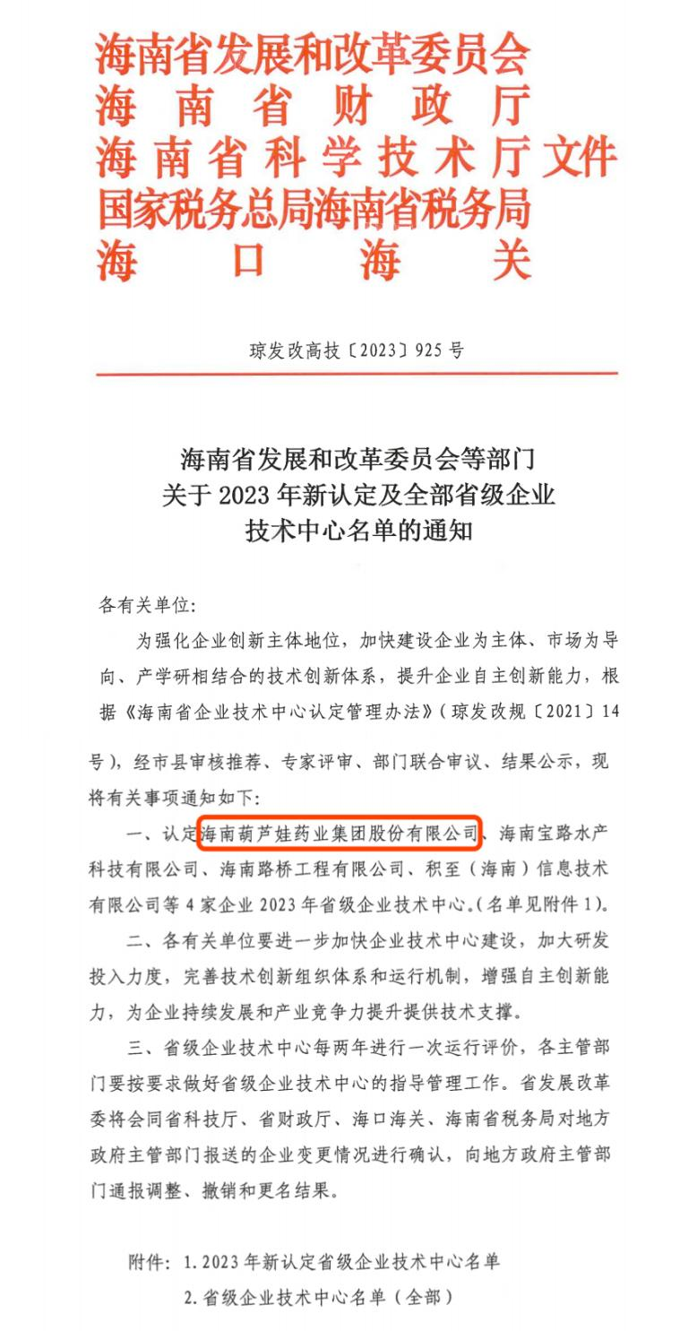 近日,海南省发改委等多部门联合公布了《关于2023年新认定及全部省级企业技术中心名单的通知》,其中,海南PG国际药业集团股份有限公司成功通过评审,被认定为省级企业技术中心,是本次获批的4家企业之一。